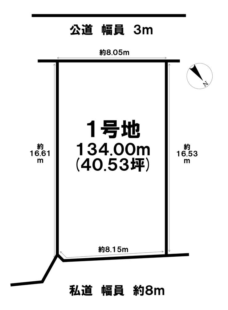 | 土地面積 | 公134㎡(40.53坪) | 接道 | 北東側(私道)幅 約8.0m 間口 約8.15m 南西側(公道)幅 約3.0m 間口 約8.05m |